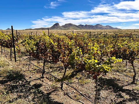 The Rune name ties in with James’ background studying history, and the winery website notes that ancient rune letters are said to be powerful symbols of divine origin. James produces a number of different wines for Rune, with a focus mainly on Rhône grape varieties. Fruit is sourced from a number of Arizona wine regions, and all of the wines that Bob and I tasted during our visit came from vineyards in the Willcox region farther east from Sonoita. Arizona winegrape-growing regions are at higher elevations to avoid the heat of lower areas such as Phoenix. Rune is located at just under 5,000-foot elevation, and Michelle told us that they grow Viognier, Grenache, and Syrah at their three-acre vineyard by the tasting room.
