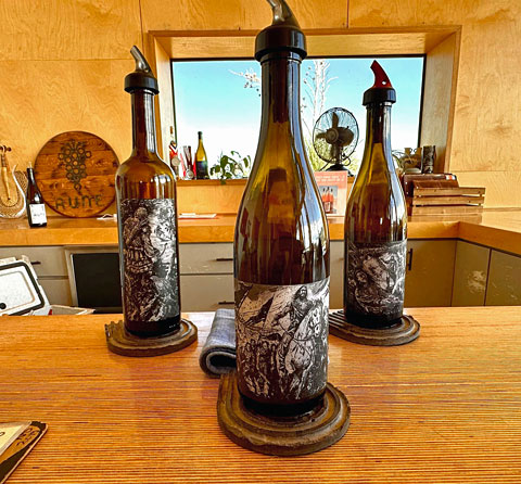 All of the Rune wines are fermented with wild or native yeast, and are made with low-intervention methods. The “Wild Syrah” was the first Rune wine that James made with wild yeast, and he considers it to be their flagship wine. The distinctive labels for the wines, designed by artist Daniel Helzer, are different for each bottling and each vintage. Each wine tells a story, and James likens this to a sort of graphic novel (with descriptive text on the back label) that progresses vintage by vintage. In addition to Rune, James has a second label called Brigand Wines, and he’s also the consulting winemaker for two other Sonoita-area wineries.