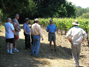 Paul Galli invited a group of people to his annual “Tour de Rhys” in late June, and I was fortunate enough to be one of the invitees this year. The timing for this year’s tour turned out to be very good for Paul – it was his birthday! On a day when the temperature reached into the upper 90s, the group – including Paul, Wes Barton, Al Osterheld, Jim Hanlon, Stewart Johnson, and Truett Welch – gathered at the Rhys Family Farm Vineyard in the hills of San Mateo County between the towns of Woodside and Portola Valley. We were met there by Rhys Vineyards owner Kevin Harvey and winemaker Jeff Brinkman. I’ve tasted wines from Rhys and from their non-estate label Alesia a number of times, but this was my first visit to their vineyards, scattered throughout the northern Santa Cruz Mountains.