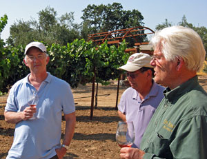 Alan, Russell, and I met at the Rockridge BART station parking lot in Oakland, and I took over the driving from there. We headed out through Walnut Creek and Concord before crossing the San Joaquin River at the Antioch Bridge and continuing into the California Delta. There, the Sacramento and San Joaquin Rivers and some of their tributaries form a huge maze of meandering sloughs, man-made channels, and islands bordered by earthen levees. After driving along a curving levee road, we turned east, soon passing through rich farmland that’s actually below sea level, kept dry by the levees. Reaching Lodi, we skirted the southern edge of the city and made our way to Hux Vineyard.