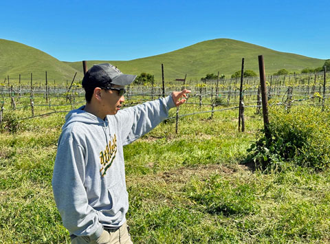 I was able to get in touch with Nat, who took the position of Siletto Family Vineyards general manager in early 2023, to arrange our visit there. Wes, Stephanie, and I met him outside of the house where he lives on the Wheeler Vineyard property, one of three current Siletto vineyard sites. The house is on a small hill, affording a good overview of the area and all three of the vineyards. Wheeler Vineyard, which the Siletto family owns, and Calleri Vineyard, which they lease, are adjacent to one another on the west side of Highway 25 and just east of Tres Pinos Creek. Siletto Vineyard is a little farther east, across the highway. Each of the three vineyard sites has about 27-30 acres planted, and the Siletto property also includes around 60 acres in addition to the vineyards.