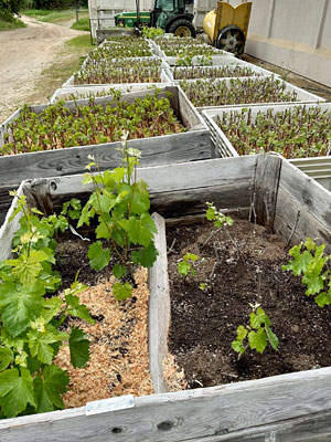 After looking at some of the head-trained vines, we continued in our cars to the vineyard barn up the hill. There we saw both vine cuttings being propagated from a number of varieties (Sérine, Aligoté, Timorasso, and more) and young seedling vines in planters that had been repurposed from old grape harvest macrobins. Randall led us to a picnic table under a tree and set out four wines that he’d brought for us to taste.
