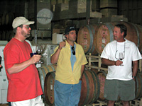 Stephan Asseo's goal is to be 100% Estate, figuring this will take from 6-7 years to achieve. As part of that plan, he has started to produce a high-end Estate Cuvee ($75), a blend of Cabernet, Syrah and Petite Verdot. In further refining his estate wine program, Stephan doesn't intend to bottle any vineyard designations, and will ultimately be abandoning both Chardonnay and Zinfandel - although abandoning Zin is tantamount to heresy in these parts. The last L'Aventure Zinfandel will be the '02. We had continued chatting as we made our way back to the barrel room, and even as Stephan started opening up a half-dozen wine bottles. Starting with the Stephan Ridge Roussanne and Red blend, and then segued into the L'Aventure wines. All very nice, especially the new Estate Cuvee. Moving from bottles to barrels, Stephan explained that he picks the final blends for both the Optimus and the Cuvee about 10 months before bottling. He uses only new oak for the L'Aventure label (80% of his 1-yr old barrels are sold off - 20% are kept for the Stephan Ridge line). I was surprised to hear that this was all new oak, because the wine's smoothness didn't seem to show any perceptible new-oak qualities. Stephan explained that this was a special toast, one that was very light - but done over an extended period of time. As we were chatting about the barrels, something about them caught my eye. Looking closer, I noticed that there appeared to be small pinholes drilled into the heads and stave ends of some of the barrels. In some cases, they were plugs fitted into the holes. And, in a few instances, it appeared that the tiny hole may have caused a wine leak. Curious, I asked what was going on here. Stephan said that some sort of wood-loving bug was boring into the oak - indicating it was pretty common in here in Paso. Seemed like an annoying little pest to have around. Stephan very graciously credits the friendship of his neighbor Marc Goldberg of Windward Vineyards, with easing the transition to Paso Robles. Marc's the primary (and maybe the only) Pinot producer in Paso, and he makes a very nice wine. It seems apparent that nearly all growers/winemakers have a common bond with each other, a bond that allows them to ignore that they are essentially competitors. In fact, Marc continues to pour Asseo's wines at the Windward tasting room. As we chatted about how Paso's reputation was becoming very well known, Stephan asked if we'd heard about the efforts of a select group of 9 westside growers/wineries that had banded together to form a group called the 'Grand Crew.' I hadn't, so he gave me a classy brochure that they'd produced. It's largely a trade group, but this type of association can often lead to something much bigger. Either way, Paso has arrived! We had a great visit. Unfortunately, all good things must end, and we had to be moving along - we still had one more stop to make, and Stephan and family were going bowling! Yes, HdR's infamous Rhône n' Bowl. Meanwhile, we had to beat a hasty path to our next stop.
