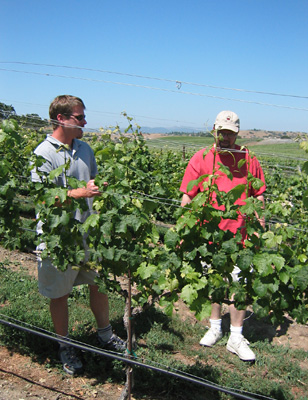 After trying a few of Jason Drew's wines at the Wine Cask's Santa Barbara Futures tasting last March, I was impressed with this relatively new small producer, and wanted to taste more of his wines. The Wednesday before HdR seemed like an ideal opportunity - the afternoon was already planned (were meeting with a large group to tour some Santa Rita Hills vineyards and taste some wine), but I thought if Jason were available Wednesday morning, it might be the perfect chance. E-mailing Jason some days later, I asked if it would be convenient to pay him a visit and taste what he had in barrel. He said "sure," and suggested we meet at his winery in Buellton - unless I wanted to see some vineyards in Happy Canyon. Well, I never turn down a chance to see and/or walk through vineyards - to me, there's just no better way to get a sense of terroir or place of a wine than to visit the source of the fruit. I knew that both Westerly and Vogelzang Vineyards were located in Happy Canyon, but really didn't know much else about the area. Since Happy Canyon was over on the east side of the valley, I'd arranged to meet Jason at 10:00am off Hwys 154 and 246, near the Santa Ynez Valley airport. Meanwhile, we headed over to Los Olivos Grocery to pick up some sandwiches for later on. Great place - just tell them what you want, or choose from some specialties (I like the "Valley Veggie.") As we were leaving, I got a call Brad Harrington - he and wife Maureen were going to join us for the tour and were in the vacinity of the airport -- where should they be? Hang on, I told him, we'll be right there, adding that he should keep his eye out for another guy hanging around, because it was probably Jason Drew. We all managed to connnect, and parking one of the cars, headed off to check out the vineyards. Jason has contracted for an acre of Cabernet Franc from Volgelzang Vineyards. He previously made a Westerly Cabernet Franc from the 2000 vintage that we tasted at his place in Buellton.