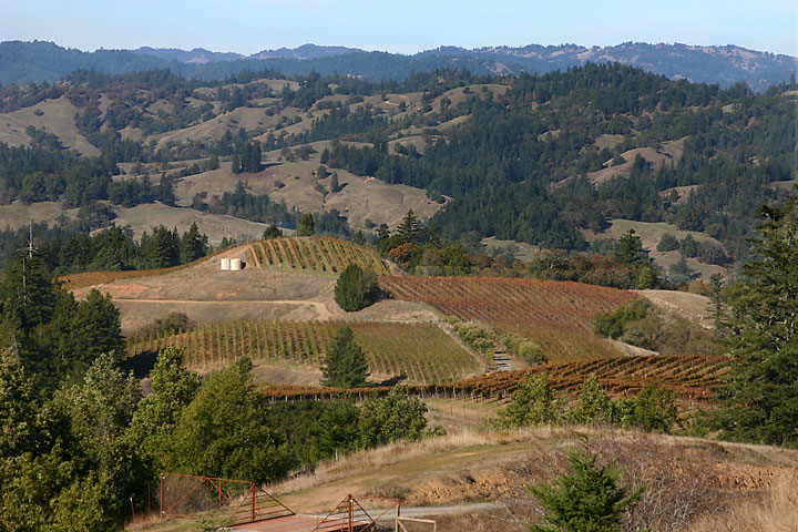 Rainfall, mostly from October to April, is abundant at an average annual eighty inches. The summer climate is dry, desert-like. The annual climate is also more than a little erratic, with wide swings in moisture, temperature, storms, and wind. At 1500’ the Pacific Ocean is visible three miles to the southwest through the redwoods and firs that dot the slopes and meadows. The rolling hills with varying slopes fan out in all directions of the compass and at all angles from level to forty percent incline. This means that vine ‘A’ may be in well drained sandstone that holds little water, and conducive to slow growth and even ripening, but vine ‘B’, a few yards away, is in a high magnesium, heavy clay that has very high water retention and consequently grows a vine with high vegetative vigor and uneven ripening.