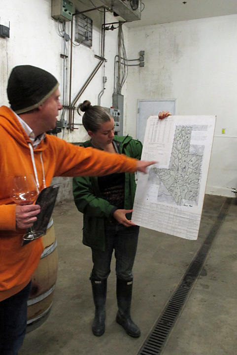 It was now drizzling a bit heavier as we huddled together outside the winery, located in the higher part of the vineyard. At Block 15 (planted to Pommard, Swan, Calera, some own-rooted) we examined the vineyard map, while listening to Jasmine and Ross explain the exposition of vineyards across the hilltops - which were now taking on an ethereal look with the low clouds and a light fog. David Hirsch (whom we'd met on our Fall 2004 trip) was not able to join us this time, but both Jasmine and Ross have an incredible wine knowledge base in general, and both in particular seemed to know nearly everything there was to know about the vineyard, its plantings, and its genesis.