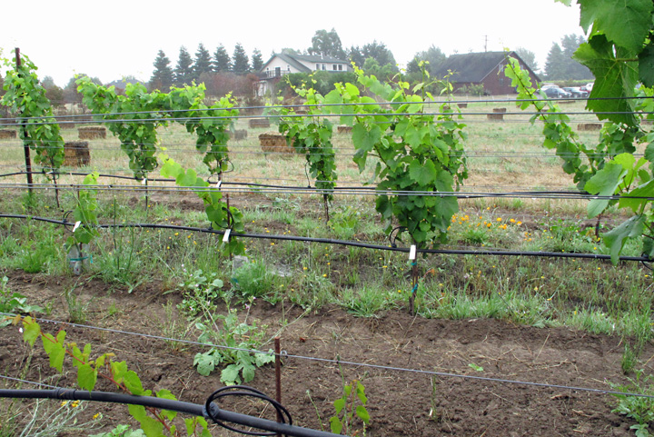 The 30-acre Estate contains 3-acres of vineyards (with 6 different clones), 14-acres of hay fields, and 10-acres of riparian area that are maintained to balance out pest pressures. This all translates to creating a native habitat for bees and wasps, with a few gardens of things like native sages, anise, yarrow and salvia that attract predacious insects such as lady bugs and dragonflys to help reduce the emergence of aphids and mites. They don't cultivate a cover crop annually between rows. But, will occasionally disc-in a legume seed mix. The whole purpose is to create conditions where the vines can take care of themselves (back to 'what does the forest know'). No spraying of pesticides, fungicides, or herbicides is done (though they will use sulpher to combat mildew). Instead, they work with plants like stingling nettle, German camomile, and horsetail that can combat those things.